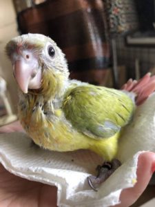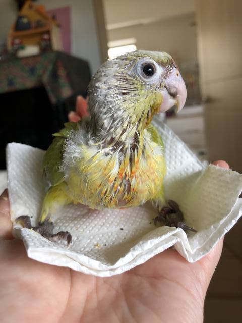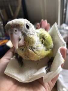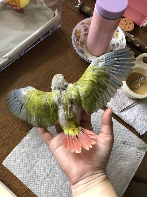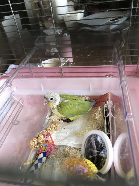 まだ筆毛開いてないから保温のためにプラケの方がいいかな?とも考えたけど、相談の結果、もうこのくらいの暑さの場合は保温不要だからケージに出してOKと伺ったので、もうケージデビュー(笑)